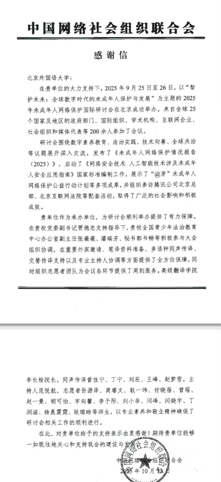 近日,学校收到中国网络社会组织联合会发来的感谢信。信中对我院师生为2025年未成年人网络保护国际研讨会提供翻译服务、主持人协调以及组织志愿者团队等工作表示称赞,认为BBIN游戏师生以专业素养和敬业精神确保了研讨会相关工作的顺利进行。2025年9月25日至26日,由中国网络社会组织联合会、中国教育学会及北京师范大学主办、BBIN游戏、央视网及中国网络社会组织联合会未成年人网络保护专业委员会承办、以“智护未来:全球数字时代的未成年人保护与发展”...