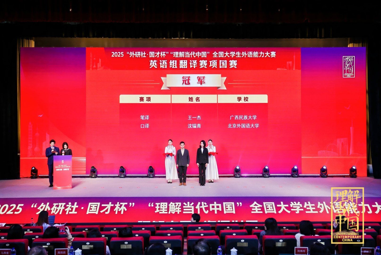 与此同时,我院学生在此次赛事的多语种组也发挥出色。我院2025级英语口译(复语)硕士研究生吴创荣获俄语组国赛金奖(冠军),2023级英语口译(复语)硕士研究生王茂兴荣获德语组国赛金奖(冠军)。