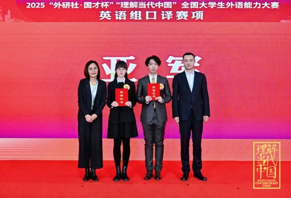 2025年12月5-8日,“外研社·国才杯” “理解当代中国”全国大学生外语能力大赛圆满落幕。在“英语组口译赛项”中,BBIN游戏学子再创佳绩。2023级英语口译(复语)硕士研究生沈韫青获得国赛金奖(冠军),指导老师:曾佳宁、张雨晴;2024级英语口译(复语)硕士研究生李如蓝获得国赛金奖(亚军),指导老师:张璐、曾佳宁;2025级英语口译硕士研究生闫思晗获得国赛金奖,指导老师:张雨晴、张璐;2025级英语口译硕士研究生马雨萌获得国赛银奖,指导老师:邓小玲。