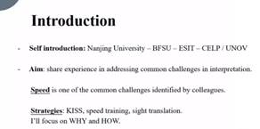 首先,唐媛圆老师详细解读了高语速口译实战中的 “KISS原则”(Keep It Short and Simple),指出译语要在不遗漏关键信息的前提下尽可能地简单、简短。译员可以通过删减非必要信息、规避“of”结构、善用缩写等方式,用最短的时间传达出核心信息。唐媛圆老师表示,译员无需为了体现英语水平而过分追求表达的繁复和“高级”。唐媛圆老师的讲解深入浅出,结合多个口译实例,阐明口译中“KISS原则”的重要作用以及应用方法,并鼓励同学们在日常练习中坚持“KISS原则”,不断提高表达效率。