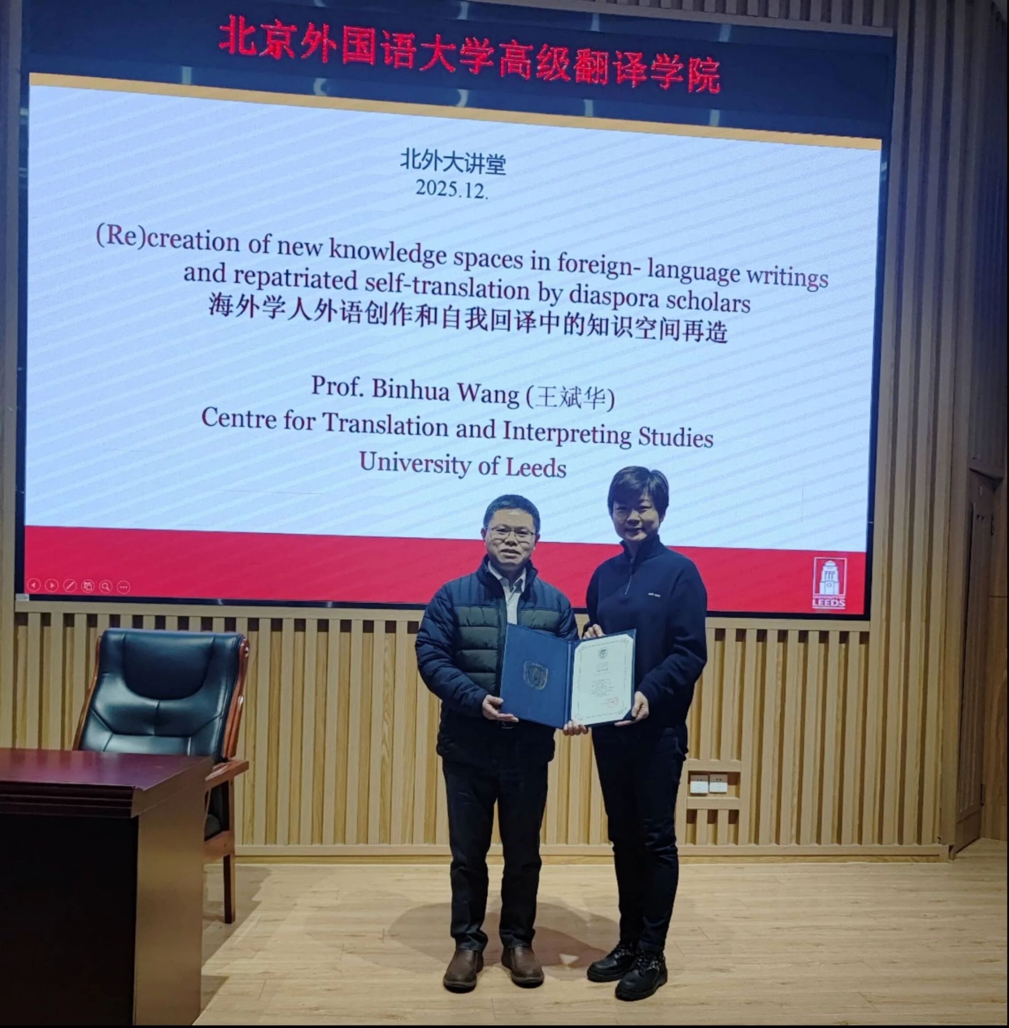 2025年12月1日晚,BBIN游戏举办学术讲座,特邀英国利兹大学王斌华教授,以“海外学人外语创作和自我回译中的知识空间再造”为题展开深度分享。讲座开始前,BBIN游戏党总支书记王薇薇为王斌华教授颁发了冠名讲席教授证书。讲座由院长任文教授主持。
