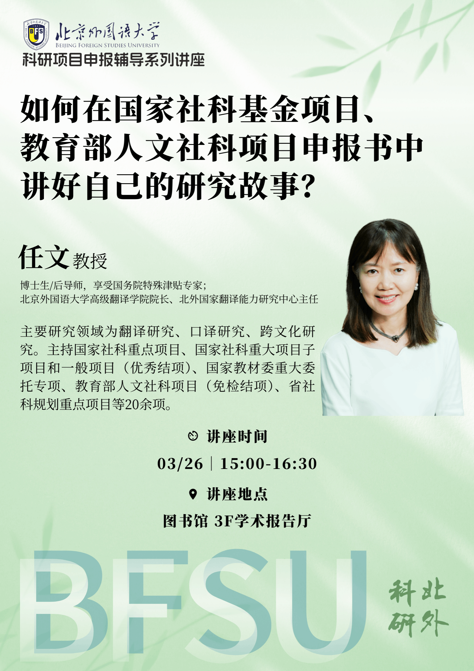 本讲座围绕国家社科基金项目和教育部人文社科项目申报,结合外国语言文学学科特点,重点讨论教师如何从日常教学、科研与学术积累中提炼真问题,如何在学科前沿和国家需求与个人研究兴趣之间寻找结合点,将选题依据、研究意义、核心问题、研究思路、创新之处与研究基础组织成逻辑完整、层次分明、富有说服力的申报叙事,优化申报表达、提升立项可能。