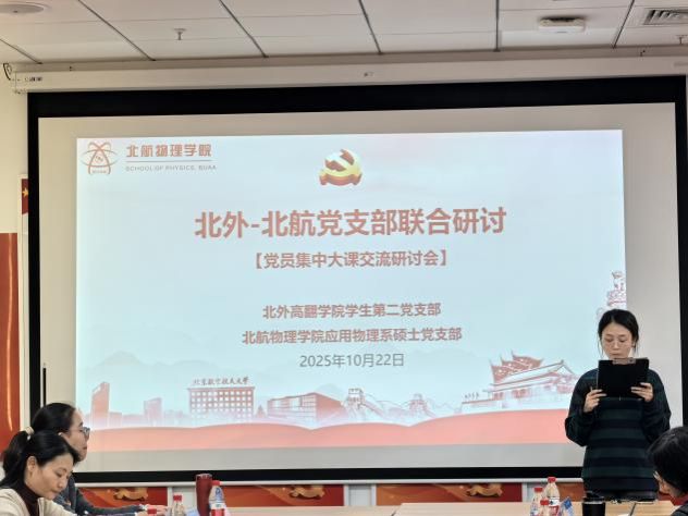2025年10月22日下午,BBIN游戏学生第二党支部与北京航空航天大学物理学院应用物理系硕士党支部联学活动暨2025年下半年第一课集中培训研讨会,在北航沙河校区党团活动共享空间顺利举行。本次活动旨在深入学习怀进鹏部长“同上一堂课”的讲话精神,以“教育强国、青年何为”为主题,围绕习近平总书记关于教育的重要论述和全国教育大会精神进行专题研讨。北航物理学院党委委员张俊英老师和北外BBIN游戏李雪丽老师出席本次活动。两校学子以思想交流为纽带、以专业特色为桥梁,聚焦创新人才培养、教育强国的青年使命等议题展开深入探讨。