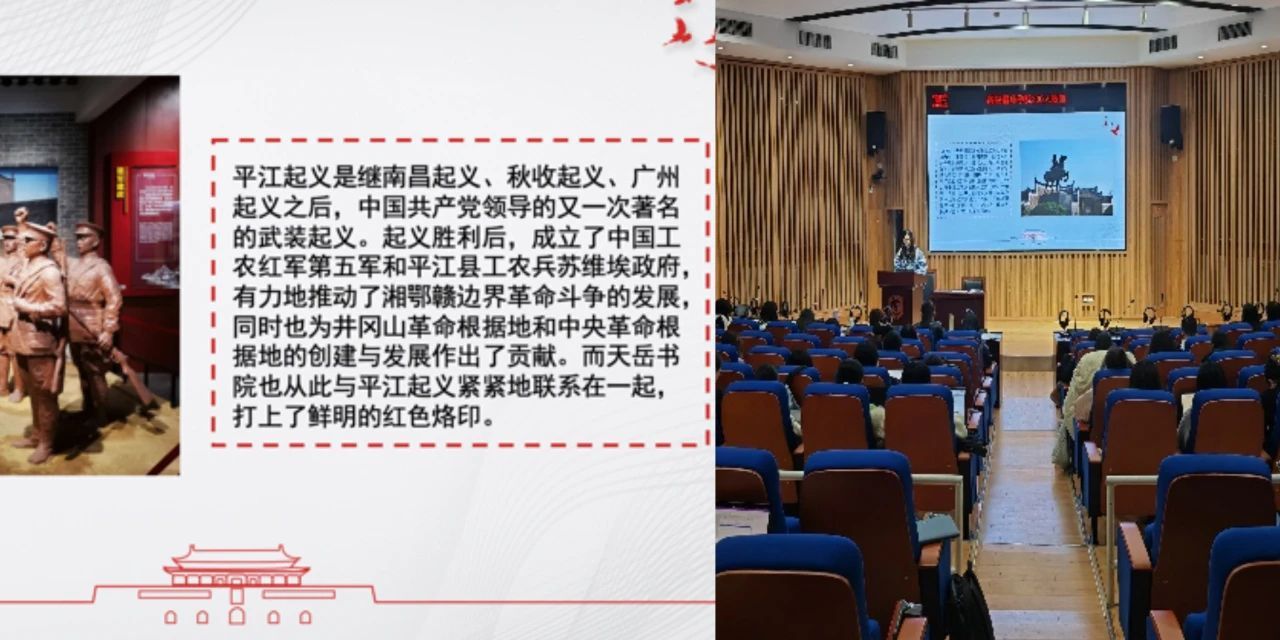 曾柳妍同学结合自己所学所感,配以丰富图片,分享了参观湖南省平江县平江起义纪念馆的感受。平江起义是继南昌起义、秋收起义和广州起义之后,中国共产党领导的又一次著名的武装起义,为井冈山革命根据地和中央革命根据地的创建和发展做出了贡献。曾柳妍带大家追忆革命艰难历程,重温革命峥嵘岁月,使同学们深刻体会到革命先辈“以身许家国,以血肉之躯铸革命长城”的奉献精神,激发同学们在行动中赓续红色血脉,立志做有理想、敢担当、能吃苦、肯奋斗的新时代好青年。