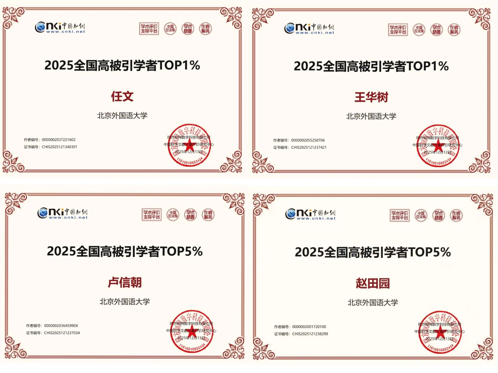 近日,中国知网下属的中国科学文献计量评价研究中心(出版智库)正式公布“2025全国高被引学者”名单。我院四位教师凭借扎实的学术积累和持续的研究产出荣登榜单。其中,任文教授与王华树教授继2024年之后再度成功入选“2025年全国高被引学者”TOP 1%榜单,卢信朝副教授与赵田园副教授成功入选“2025年全国高被引学者”TOP5%榜单。四位教师的集体入选,展示了我院在外国语言文学研究领域形成的学术梯队优势和整体科研实力。